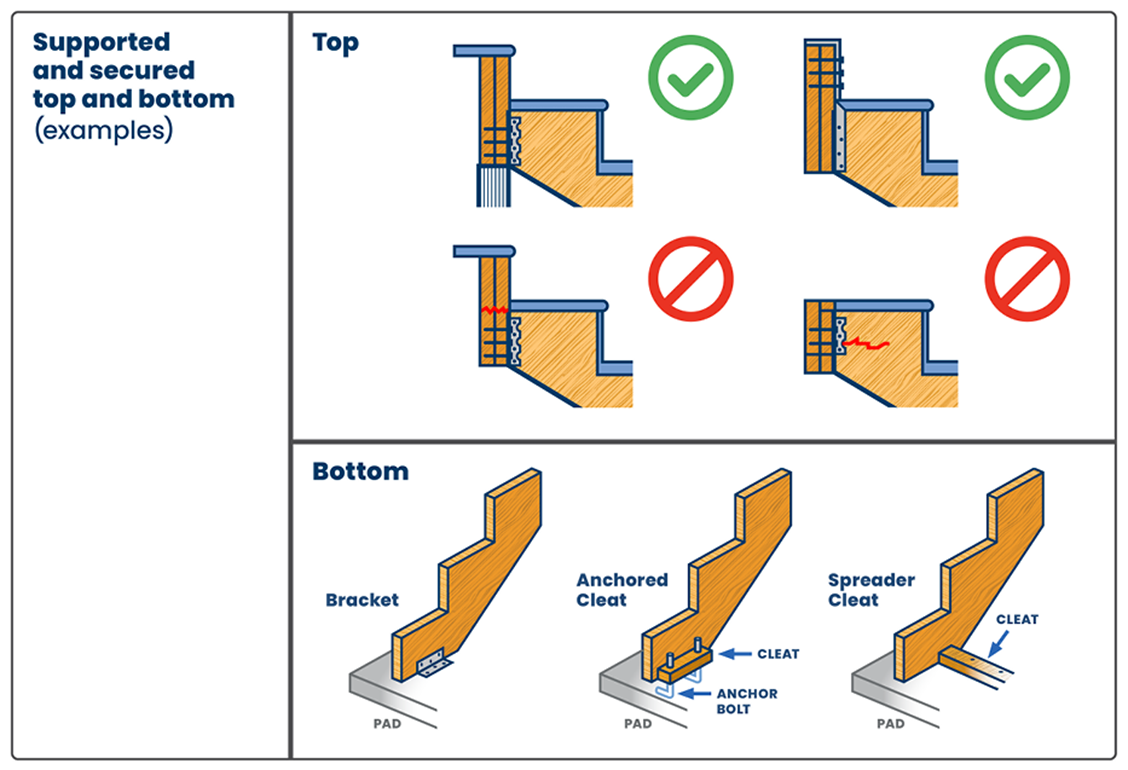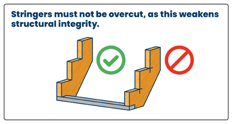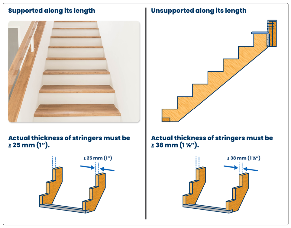 Secured – The stringer must resist rotation (especially important for open riser stairs). Blocking between stringers may be used to prevent movement.