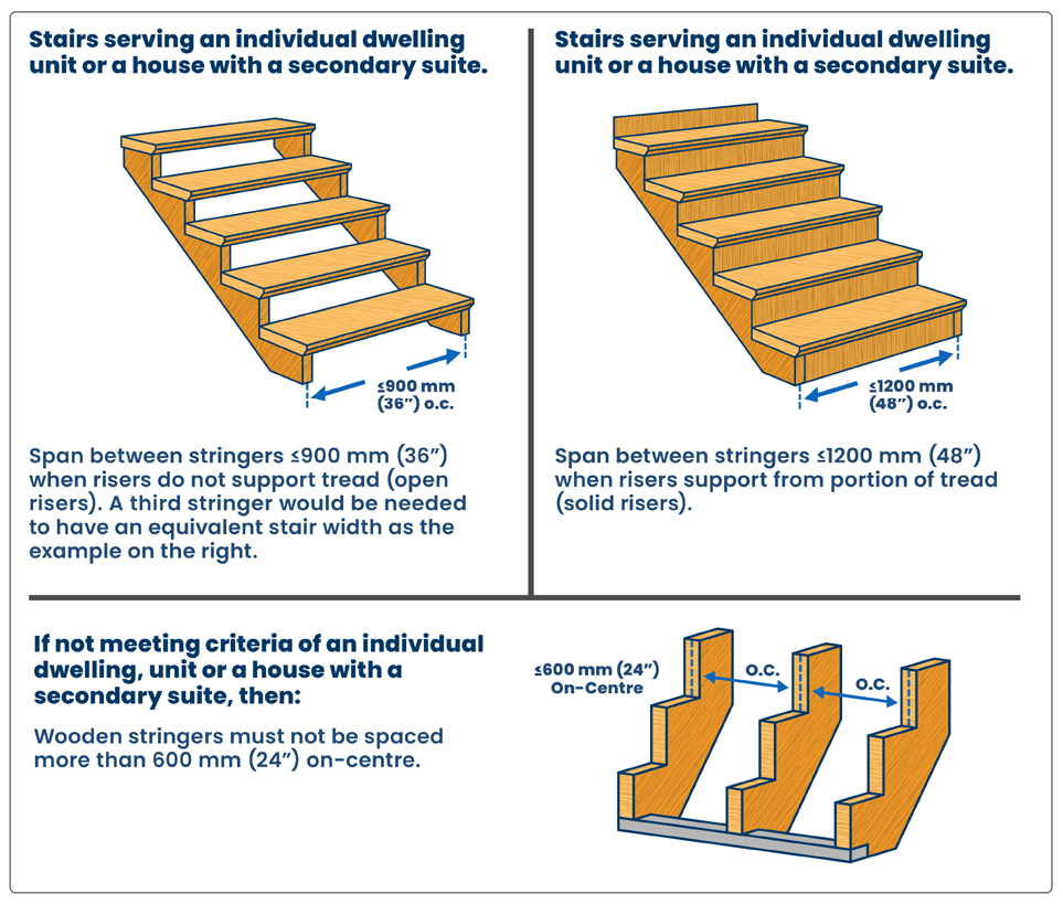 Many conditions must be satisfied to ensure stairways are NBC-compliant. See illustrations below that visually demonstrate the specific NBC criteria for wooden stairs.